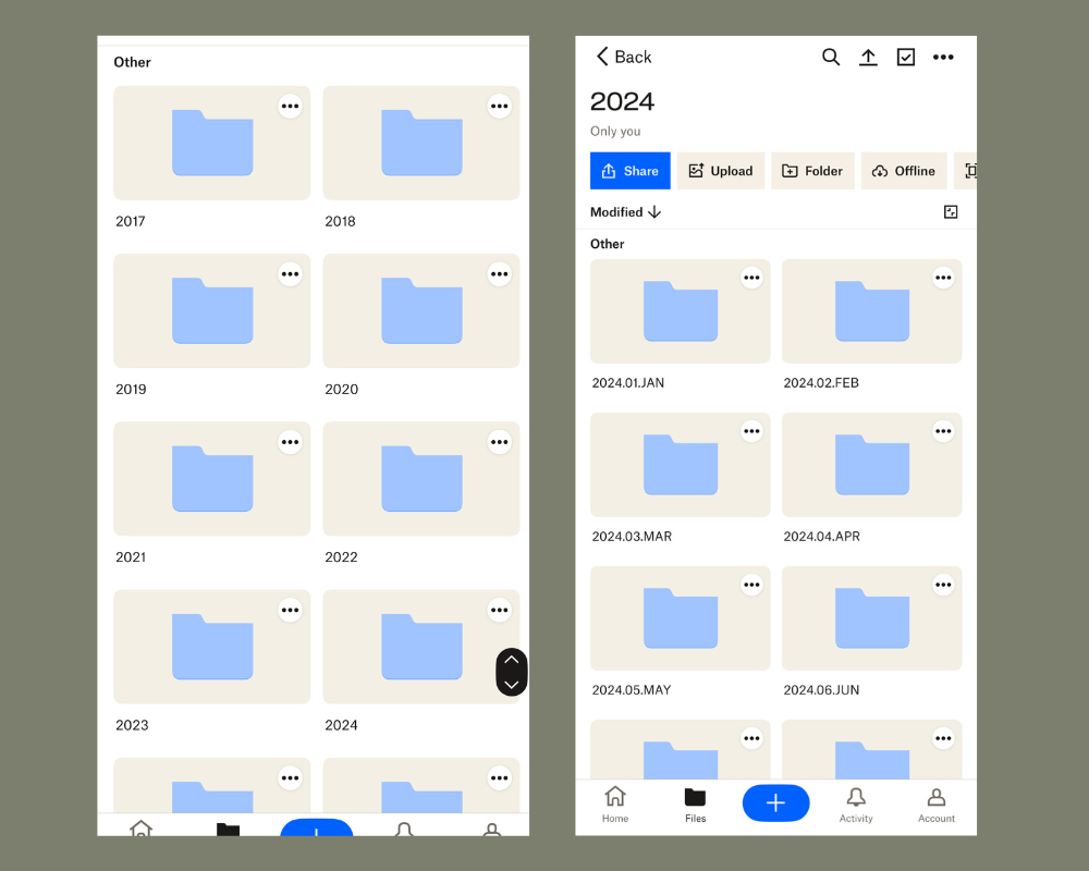 - Name each month’s folder using this format: Year.Month Number.Month Abbreviation (e.g., 2025.01.JAN, 2025.02.FEB).